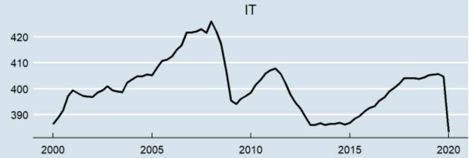 Il grafico rappresenta l’ andamento del PIL in Italia dal 2000……nel 2020 ha chiuso a -10% circa…….OPS.