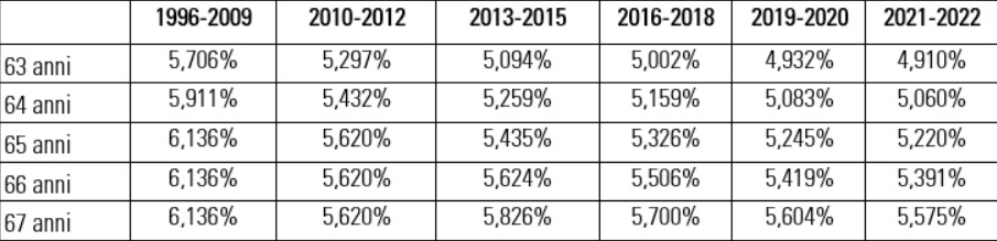 Come puoi notare dalla tabella, il coefficiente varia a seconda dell’ età in cui si va in pensione, viene rivisto ogni 2 anni, e di fatto sta calando….
