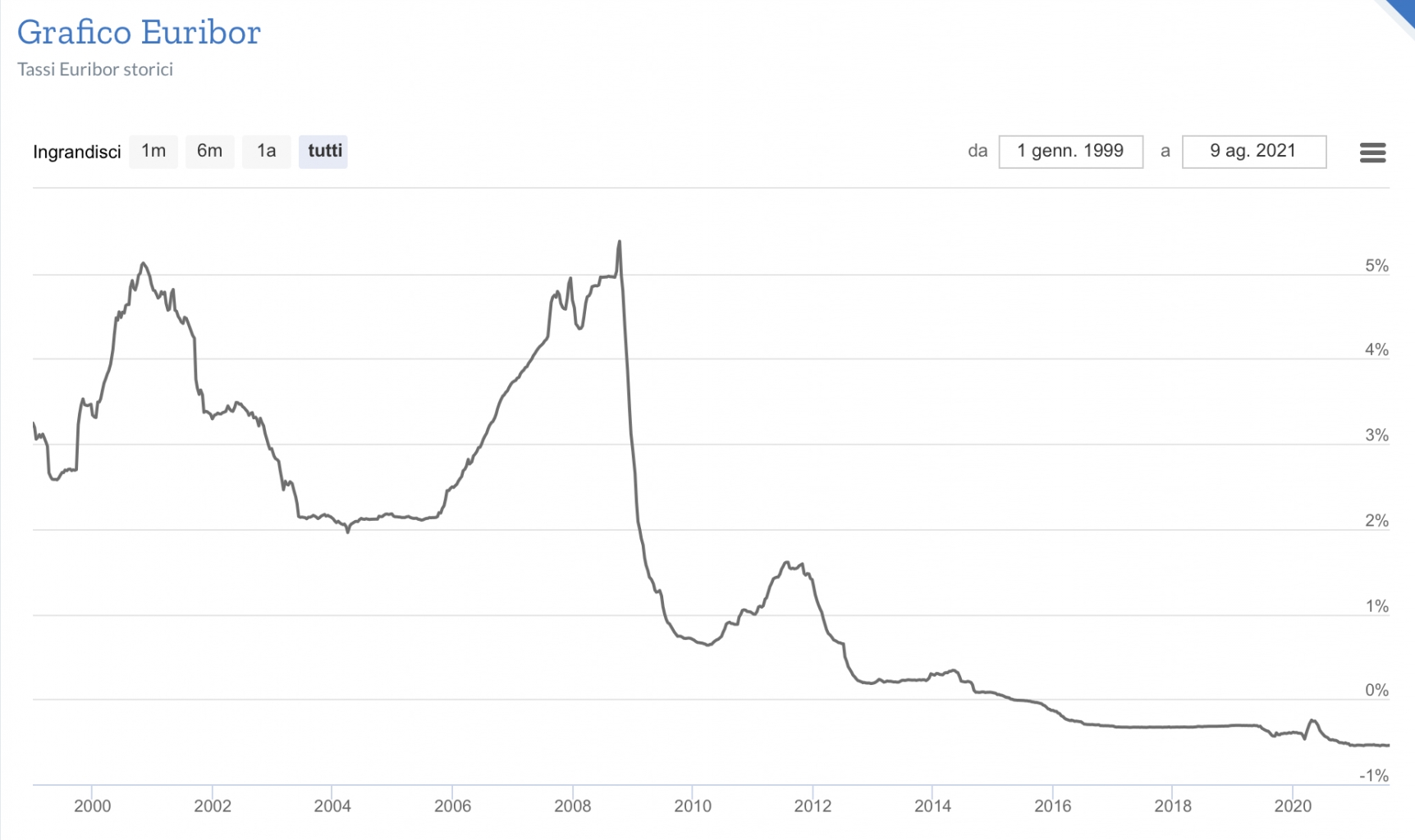 In questo grafico puoi vedere l’ andamento del Tasso Euribor a 3 mesi (molto utilizzato nei mutui a tasso variabile).