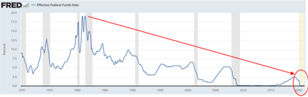 Come si vede da questo grafico (fonte FRED), i Fed Funds Rate stazionano nell’intervallo 0-0,25%.