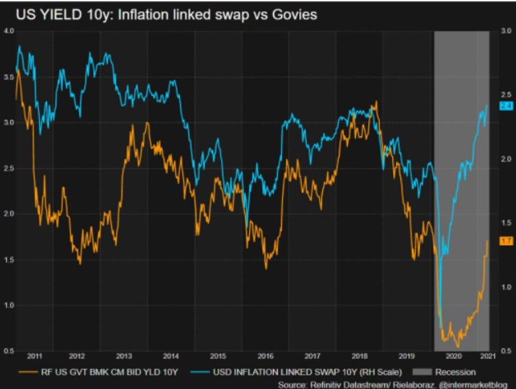 Evidentemente il mercato non crede molto alle parole di Powell e continua a vendere l’obbligazionario, probabilmente perchè si aspetta una crescita dell’ inflazione più alta del previsto e pertanto un rialzo dei tassi molto prima del 2024 ipotizzato da Powell.
