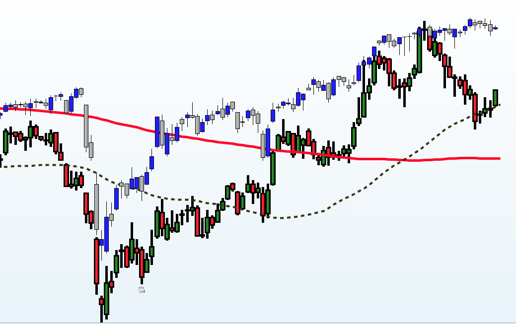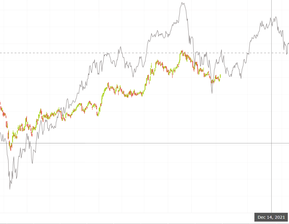 (indice DAX = grafico a candele blu/grigie; Bmw= grafico a candele verde/rosse)
