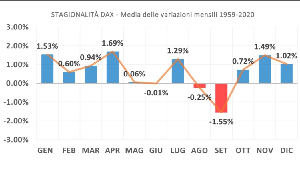 In questa tabella vediamo la stagionalità dell' indice DAX degli ultimi 60 anni.