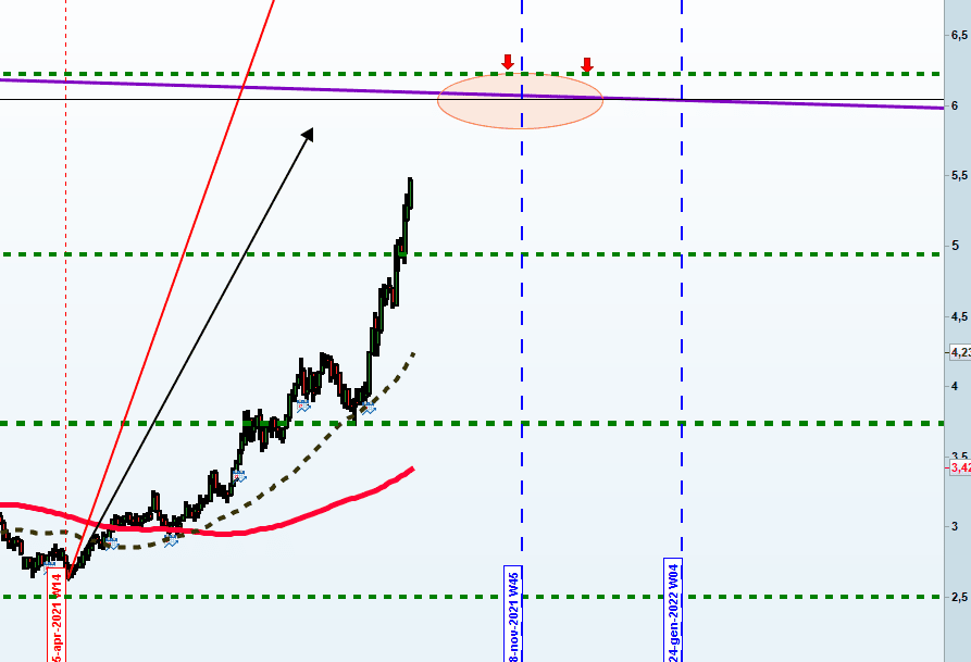 Nel Medio periodo invece i prezzi hanno subito una seconda impennata dopo il minimo registrato in Aprile 2021 (2,64 $). Di fatto il prezzo si è raddoppiato e si sta dirigendo verso un importante livello rappresentato dal grafico sopra riportato, (da una linea diagonale viola e da una linea orizzontale verde), in area 6 - 6,20 $.